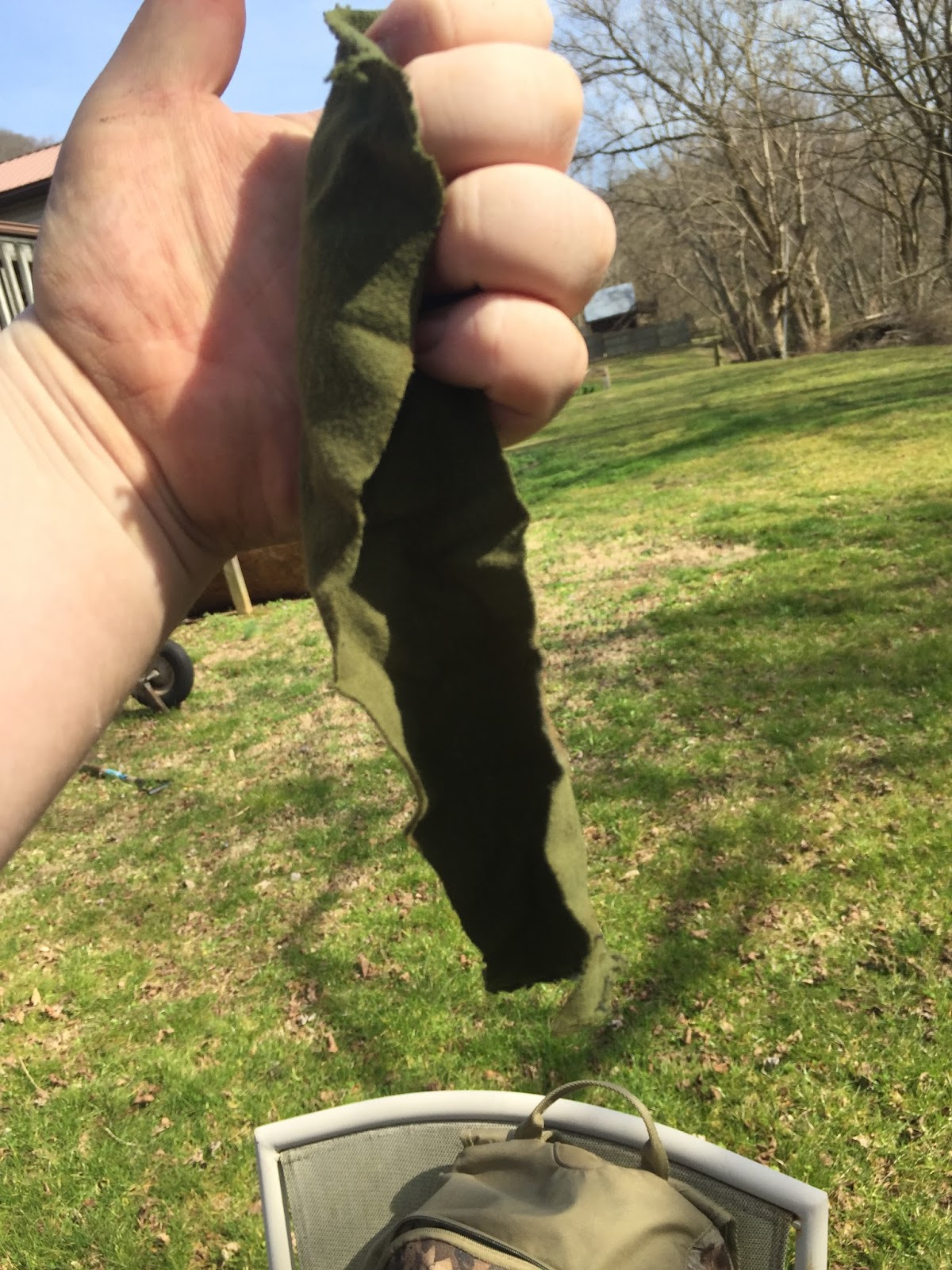 As you can see from the picture on the left, that is as much water as I got from the flour sack towel after 5 hours. There was even less water in the bandanna jar. Neither of these did a great job purifying the water, and it took entirely too long. It would be even better to set up a simple tripod water purification system. The next thing we are going to do is try to make charcloth. I've cut a strip of bandanna and a strip of flour sack towel. The flour sack towel I'm sure will make great charcloth because it is 100% cotton. The bandanna I'm not so sure because it does have polyester in it, and I am unsure of how it will affect the composition.