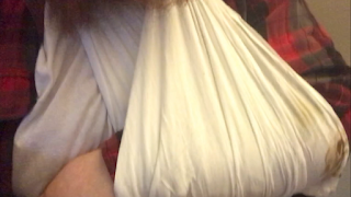 Next we will try the large bandanna material. The easiest way to do this after getting a triangle shape is to tie an open loop in one end, one that will tighten as you pull on it, feed the other end through the loop and then place your head and arm into the sling. To adjust it, all you would need to do is pull on the loose end that is through the loop and tie it off where it is the most comfortable. Now we have mentioned before that this is such a bulky piece of material so I am really excited to see how the flour sack towel does.