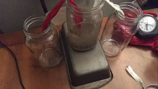As you can see from the picture on the left, that is as much water as I got from the flour sack towel after 5 hours. There was even less water in the bandanna jar. Neither of these did a great job purifying the water, and it took entirely too long. It would be even better to set up a simple tripod water purification system. The next thing we are going to do is try to make charcloth. I've cut a strip of bandanna and a strip of flour sack towel. The flour sack towel I'm sure will make great charcloth because it is 100% cotton. The bandanna I'm not so sure because it does have polyester in it, and I am unsure of how it will affect the composition.